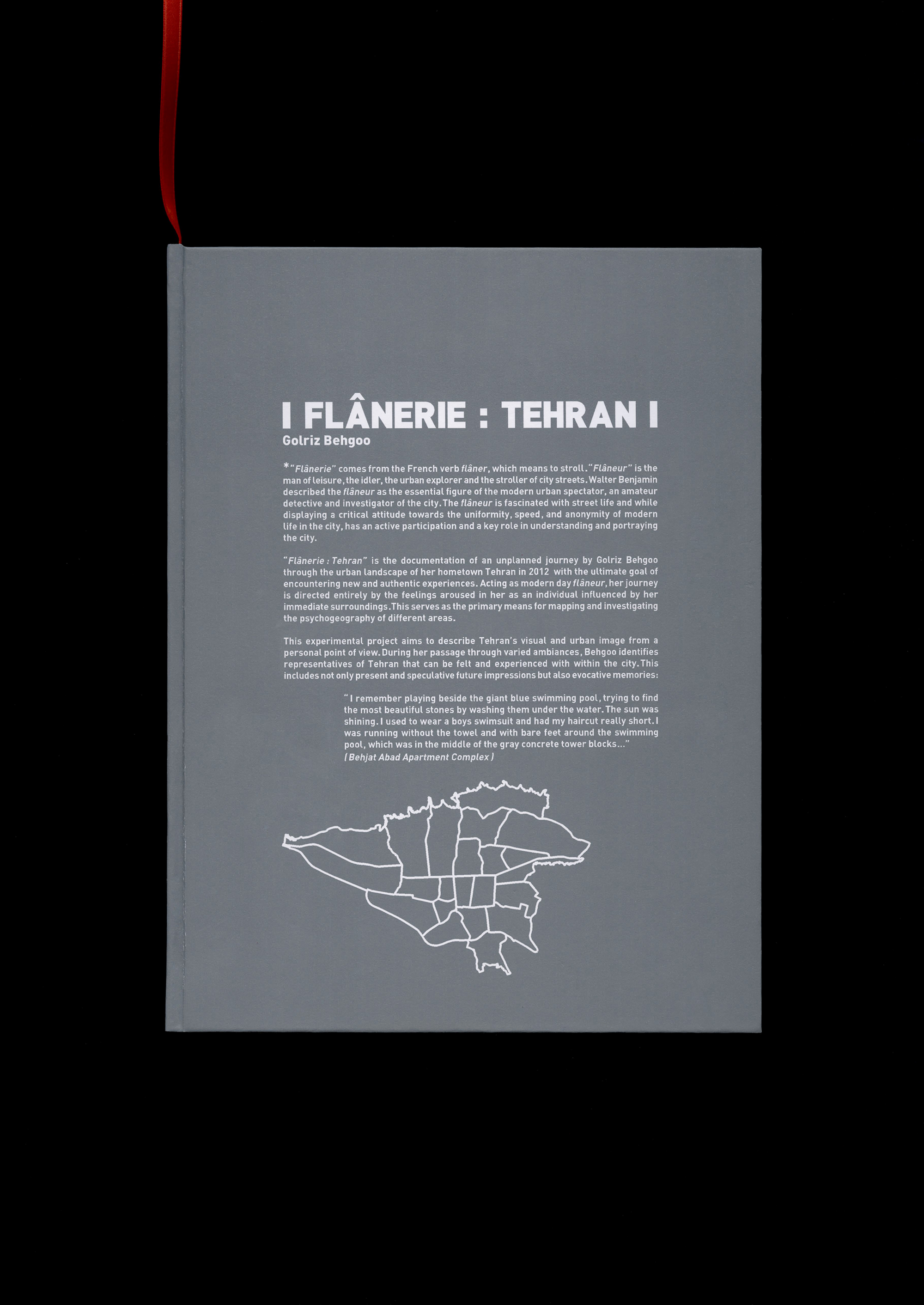 Flanerie : Tehran is the documentation of an unplanned journey by Golriz Behgoo through the urban landscape of her hometown Tehran in 2012 with the ultimate goal of encountering new and authentic experiences. Acting as modern day flâneur, her journey is directed entirely by the feelings aroused in her as an individual influenced by her immediate surroundings. This serves as the primary means for mapping and investigating the psychogeography of different areas.