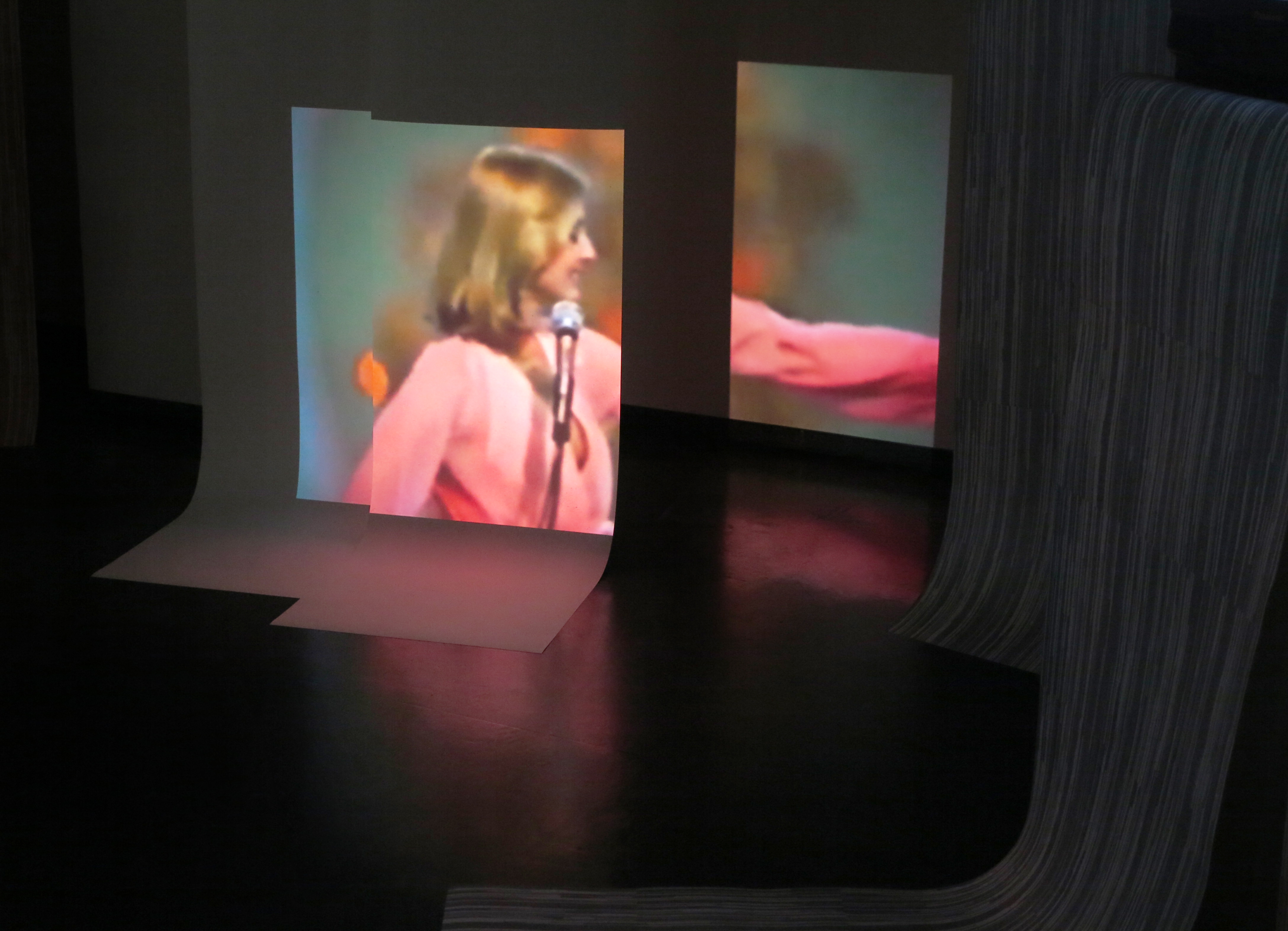 'Strangely Familiar' explores the idea of a contrasting but also shared cultural heritage in both Iran and the UK. Based on a vast collection of pop cultural material gathered by the artists and produced in the years immediately preceding and following 1979, the final installation displays a glut of images, videos and sounds.When viewed together, these conjure a particular series of emotions and connotations, both historical and contemporary, the juxtaposition of media from different cultural backgrounds being simultaneously unsettling yet familiar. The theatrical trope of a foil curtain, witnessable in many of the collection's images and videos, is reproduced on paper, a decorative static hum which provides a backdrop onto which media plays, an endlessly repeating series of slide projections and video clips.